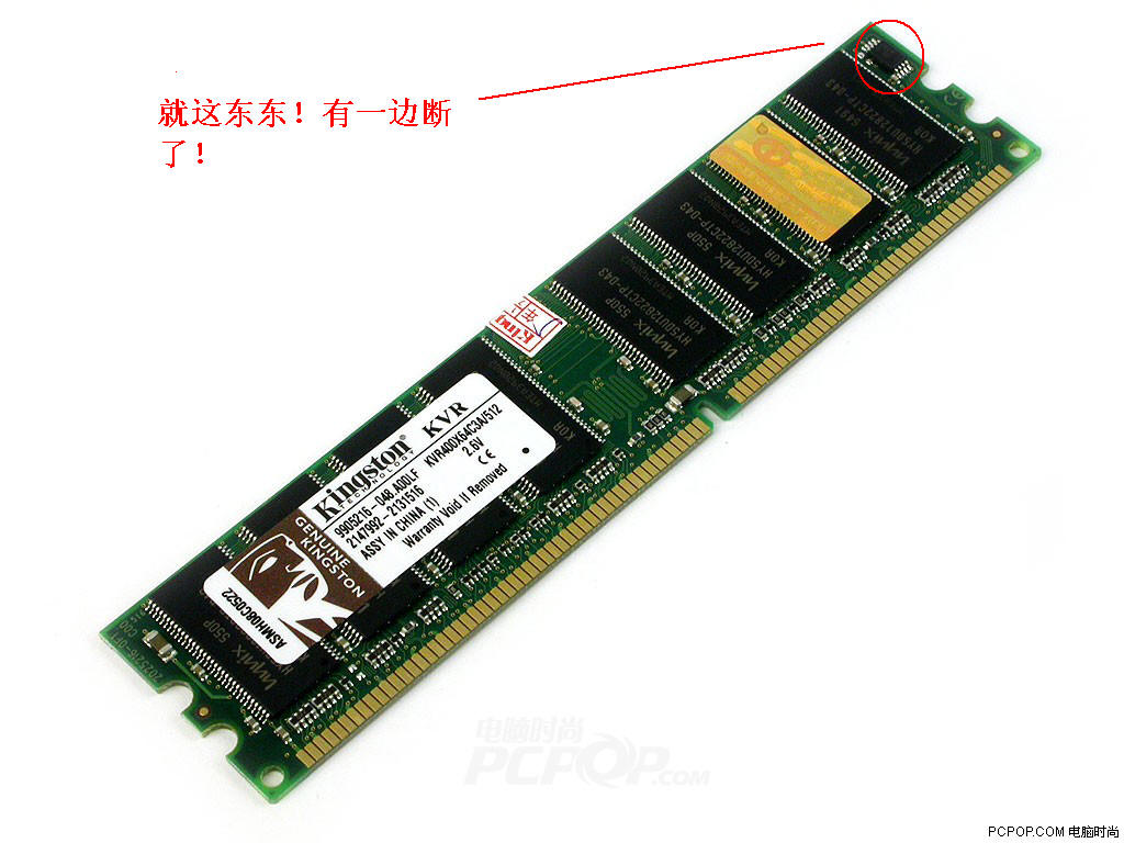 今天刚买回来了,金士顿DDR400的512内存,可能和颗粒不一样吧,和以前两根金士顿内存条不一样,总是蓝屏,我的主板上有3个内存插糟,我反复在三个插糟上插了几次,因为是晚上,光线不好,不小心把原来的内存条最边上的东东搞断了,如图,请问还能修吧?