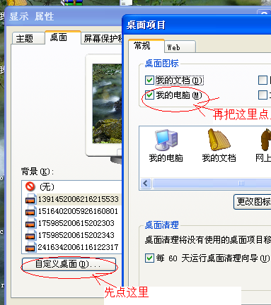 在桌面空白处右键单击,“属性”-“桌面”-“自定义桌面”-“常规”中选上“我的电脑”,应用确定即可。