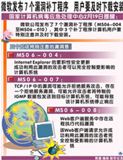 新华网天津2月19日电(梁宏、张建新)国家计算机病毒应急处理中心19日提醒,微软公司发布了7个漏洞补丁程序(MS06-004至MS06-010),其中3个补丁程序计算机用户要特别注意并及时下载安装,防止计算机系统受到利用这些漏洞进行传播的病毒的入侵破坏。