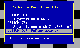 这是一个进行分区大小的选择,DM提供了一些自动的分区方式让你选择,如果你需要按照自己的意愿进行分区,请选择“OPTION (C) Define your own”。