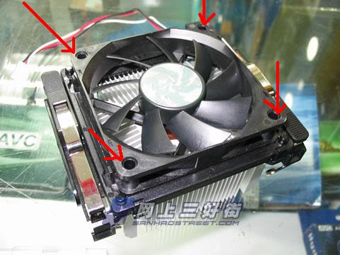 箭头处拆下螺钉,把风扇翻过来,撕下贴纸,看到轴了吗?——加1、2滴高级机油!