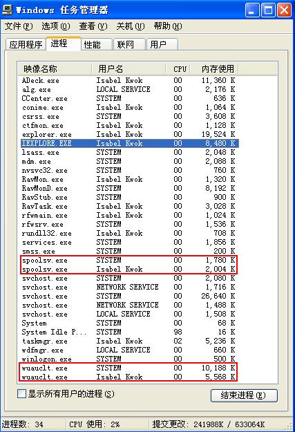 刚刚重装的系统,是XPSP2,发现进程里有两个spoolsv,一个的用户名是我的用户名Isabel Kwok,另一个的用户名是System,而且目前都没有占用很大的内存和CPU,看起来貌似是正常的,用瑞星查杀,没有报告有病毒。