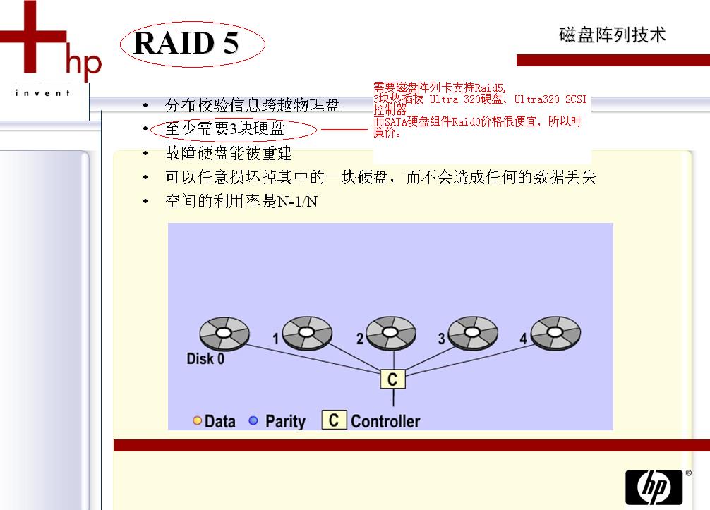 RAID 3 :RAID 3存放数据的原理和RAID0、RAID1不同。RAID 3是以一个硬盘来存放数据的奇偶校验位,数据则分段存储于其余硬盘中。它像RAID 0一样以并行的方式来存放数,但速度没有RAID 0快。如果数据盘(物理)损坏,只要将坏的硬盘换掉,RAID控制系统则会根据校验盘的数据校验位在新盘中重建坏盘上的数据。不过,如果校验盘(物理)损坏的话,则全部数据都无法使用。利用单独的校验盘来保护数据虽然没有镜像的安全性高,但是硬盘利用率得到了很大的提高,为n-1。