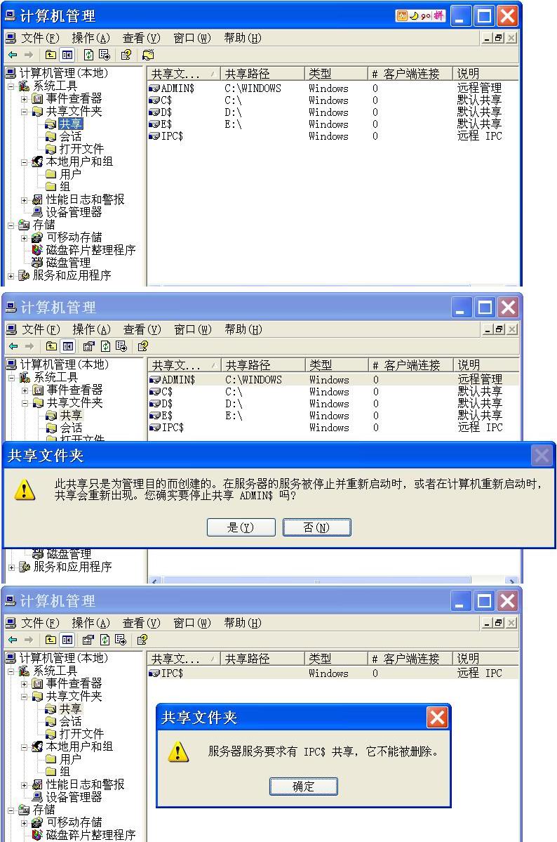 以上是在关闭IP$~C$~D$等磁盘分区的默认自动共享修改注册表以后再用批处程序执行一次即将删除默认自动共享的磁盘分区和目录。