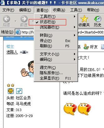 我是Xp,用的IE6.0!今天我打开IE后,感觉有点不对劲,就是IE界面下边缘原来的一个边,显示网址和进度条的那个框框没了!