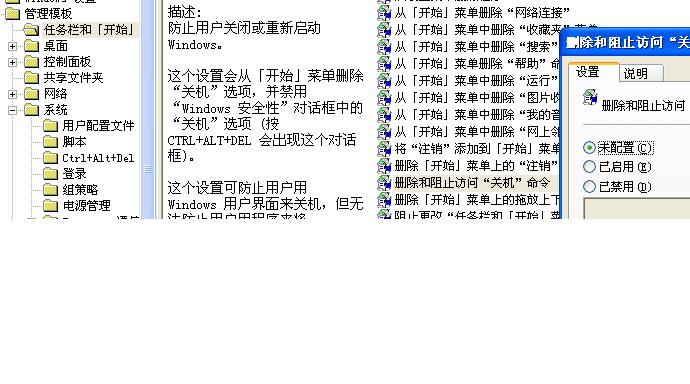 要恢复开始菜单上的按钮,可按如下操作:在“开始”→“运行”→打入“gpedit.msc”回车再在如下图所示找到→“用户配置”→“管理模板”→“任务栏和[开始]菜单”下的右面找到“删除和阻止防问“关机”命令”→再双击它,→选中“未配置”项→击应用或确定,即可。