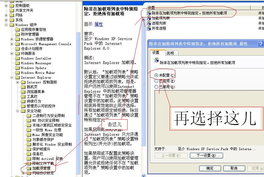 在“开始”→“运行”→“gpedit.msc”回车→进入“组策略编辑器”后,找到“用户配置”→“管理模板”→“windows组件”→“internet explorer”→“安全功能”→“加载项管理”→如下图所示的操作即可。最后击应用
