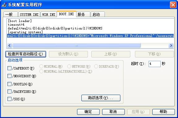 如果你现在的系统在C盘的话,就删除:multi(0)disk(0)rdisk(0)partition(3)\WINDOWS="Microsoft Windows XP Professional" /noexecute=optin /fastdetect