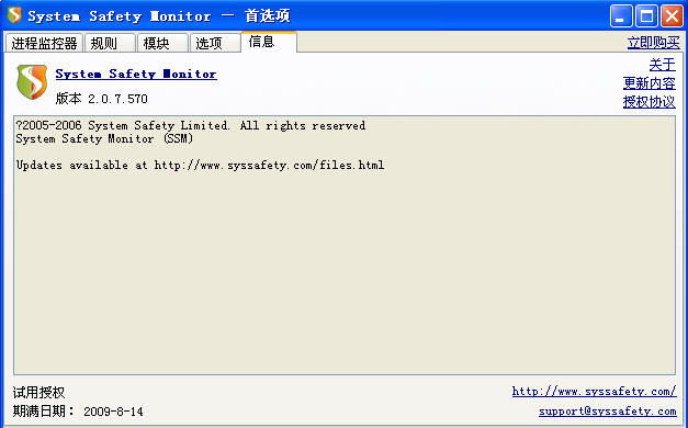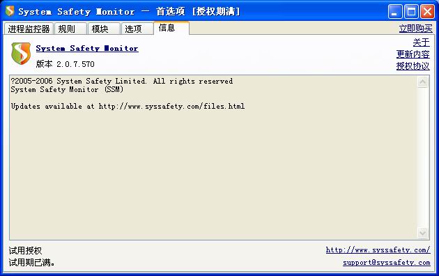 低版本的SSM(SSM2.0.0.xxx)有一个BUG。利用这个BUG,可以将SSM 2.0.7.570以及低于此版本的SSM的试用期限任意延长。我在一台笔记本和一台台式机(系统都是XPSP2)上分别试了一下,成功。方法如下:
