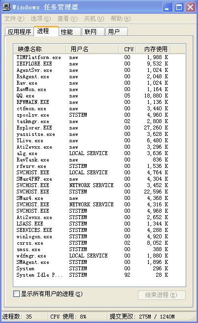 【嘎嘎吱吱的贴子】我家刚装了瑞星杀毒软件(已升最新),可是在开机的时候左上角只显示"瑞星个人防火墙"的图标,并不显示杀毒软件的标志.而且看到桌布以后要等待5-6秒才能显示桌面上的图标以及底下的工具条.并且瑞星的小伞始终是红色的,点击"开启所有监控"也无法打开.把瑞星监控中心的勾全打上也不起作用.杀毒时也没有任何病毒````Windows任务管理器中进程一大串```
