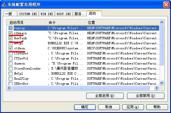 开始--运行--输入“MSCONFIG”--回车--点“启动”选项目卡。除下图红框中的三个DD外,把其他的启动项目的勾选择全部取消,然后点“确定”,最后按要求重启电脑。