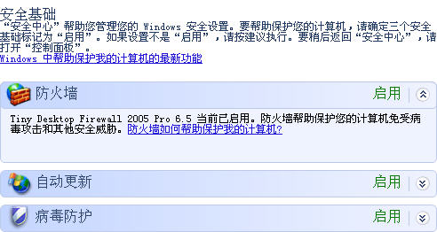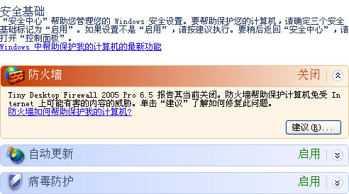 我的tiny desktop firewall 2005 pro 6.5明明是开着的,windows安全中心报告其关闭了,这是这么回事?