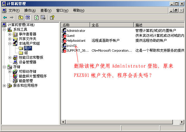 如果文件都在C盘以外的其它分区,应该可以直接删除PXZX01帐户?