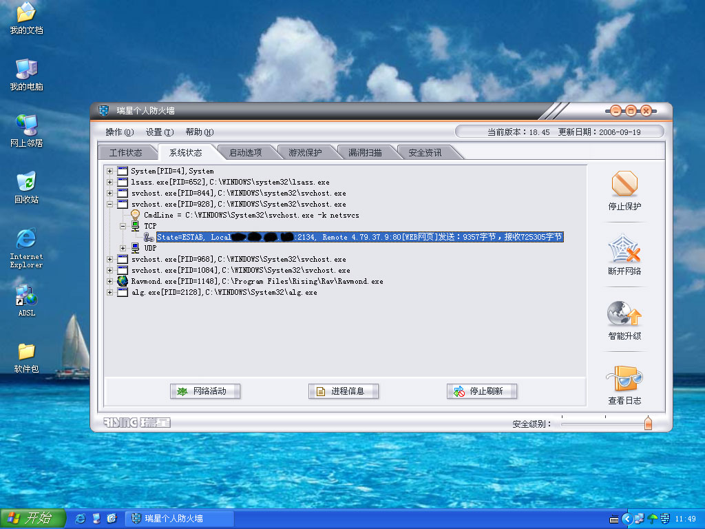 系统是windows xp sp2,进程中始终有四个svchost.exe进程,其中一个进程在连网后,总是向以下IP地址发送消息和接收消息: