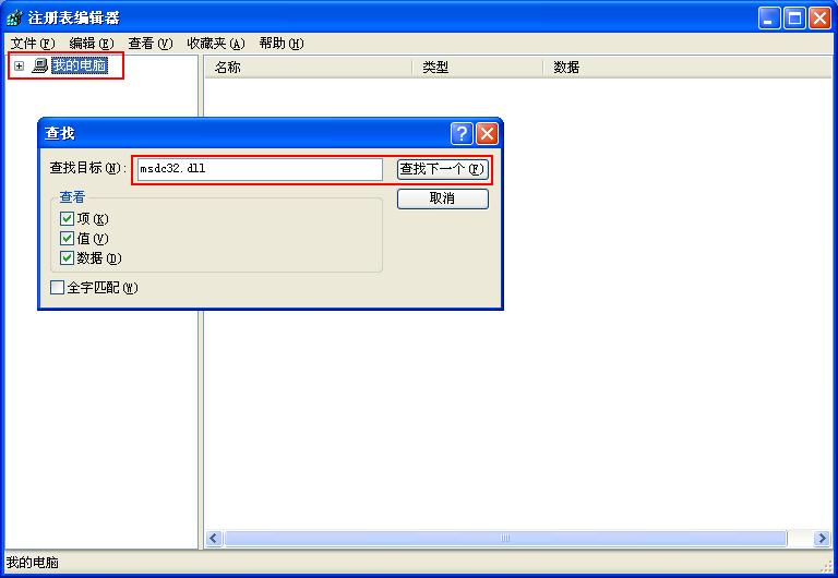 在出现的窗口里 点编辑,查找, 查找 msdc32.dll