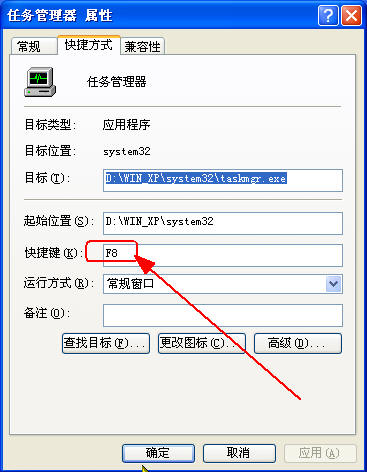 在“c:\WINdows\system32\”文件夹里找到“taskmgr.exe”程序,将发送到桌面创建一个快捷图标,再指到它的击右键选择属性再设置一个快捷键,比如设置为“F8”即可只要按下F8键即可调出它来。参见下图所示