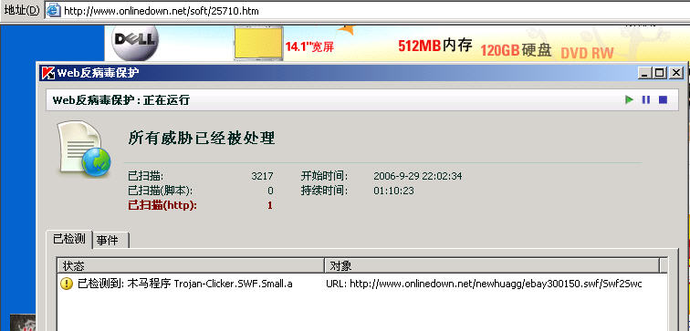 进入每个下载软件的页面,卡巴均提示页面上发现病毒,如图。请大家验证一下,http://86516.onlinedown.net/soft/5.htm,这只是其中的一个,大家可以随便选择一个下载页面试试,不要下载。