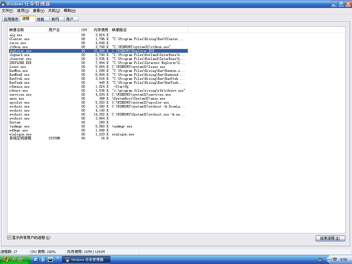 今天开机后CPU的占有率一直高达100%,请问各位大虾这是什么原因呀,附上进程图,里面的桌面的那一项进程怎么那么高呀