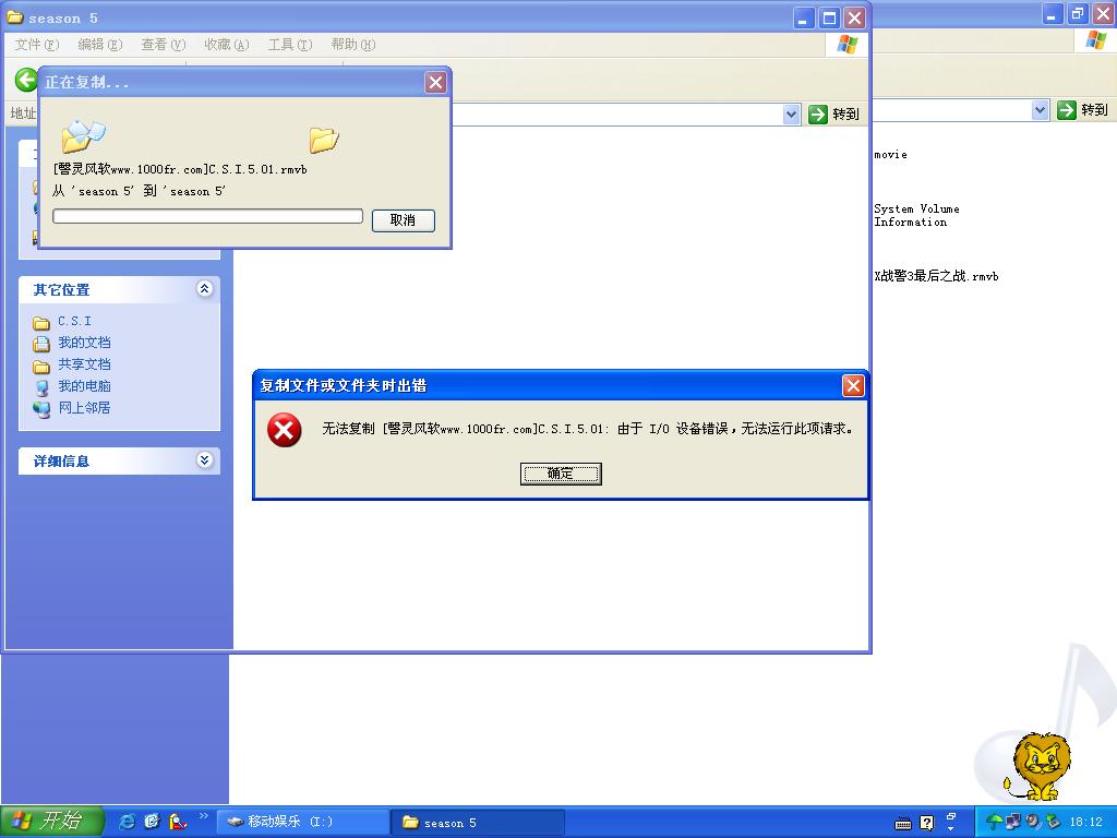 我的移动硬盘(普通笔记本硬盘+盒子组装)在我这台电脑上不能考出东西,一考就弹出如下窗口,而且我的移动硬盘分了两个区,进入其中一个区反应很慢,另一个区却很快,但是都不能考文件出来,后来我试了一下发现能考文件进去。前几天中过一个(DESKTOP.EXE,DESKTOP2.EXE,FOLDER.EXE,AUTORUN.INF)生成如上文件的病毒,现在病毒杀除了,不知怎么硬盘不能用了,是不是被改什么设置了,麻烦大侠们进来看看帮忙解决一下。