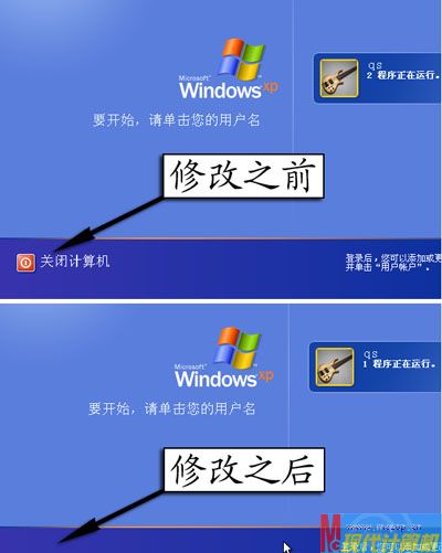 现在,我们再点击“Windows+L”锁定计算机看看,左下角的“关闭计算机”按钮是不是已经消失得无影无踪了(如图),上面是设置前的锁定计算机界面,下方的设置后的锁定计算机界面。