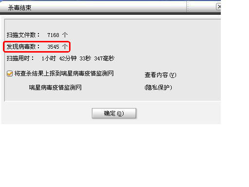 我用瑞星查出的也是3545个,但用的时间是2分47秒15毫秒,你的瑞星怎么花了1小时42分钟之久?