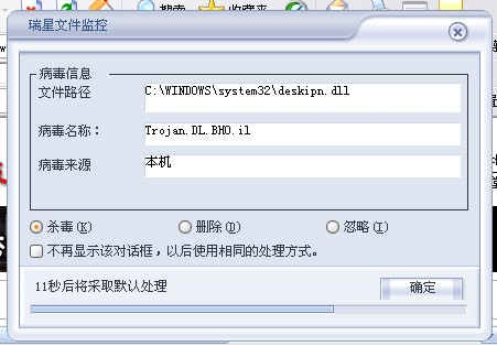 可现在问题是每次开机瑞星会病毒报警,让我选杀毒也没用,开机后仍然会提示,