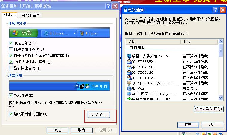 比如:小喇叭,杀毒图标,迅雷图标,还有安全删除硬件,网络连接,等图标都没了.在程序中重新点开后又出现了但关机重启后又没了.(小喇叭和安全删除硬件,网络连接因不知道在哪点开故一直未现.)