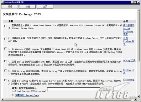 图中左边是关于Exchange的一些信息以及微软网站上关于Exchange的一些链接,可以在安装之前仔细阅读一下,加深对Exchange server的了解。图中右边是Exchange 2003的一个部署工具。点击部署工具,根据自己实际工作场景和环境选择合适的安装方式。我们在此选择安装全新的Exchange2003服务器,然后出现安装任务别表,如下图: