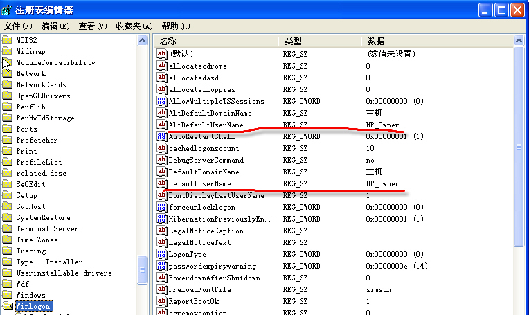 进入注册表后,进入HKEY-LOCAL-MACHINE\SOFTWARE\Microsoft\WindowsNT\Current Version\WinLogon,发现有两个HP_Owner的键值,如图。我把这两个键值改成nature2006,但下次登录时显示用户名为HP_Owner,且注册表中的改过的这两个键值也自动变成了HP_Owner。