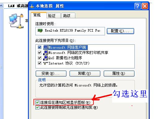 开始--控制面板--网络连接--右击本地连接--勾选“连接后通知区域显示图标”。