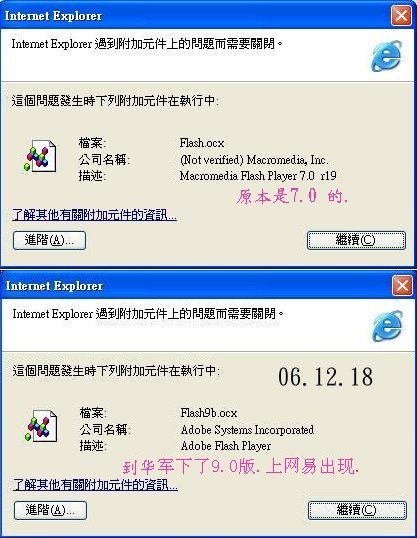 我安了一个FLASH播放后.原来能放的,现在又不能放了.原来放不出来的,现在可以播放了.是不是不兼容的问题呀.我没清理系统前,都能放的.谁给个兼容的FLASH播放器???