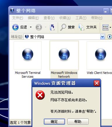 新装xp vista(直接恢复下载的DIY镜像文件),发现无法浏览局域网计算机,且无法更改计算机工作组。打开局域网时提示如下图: