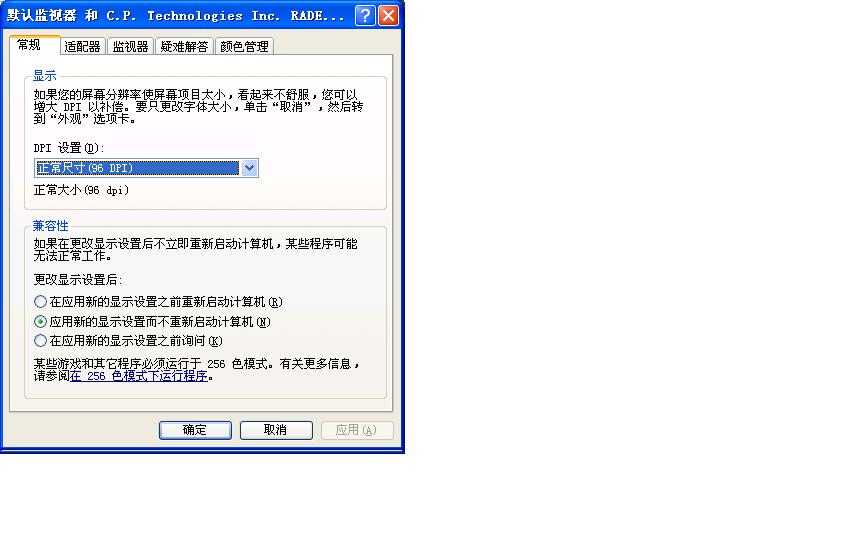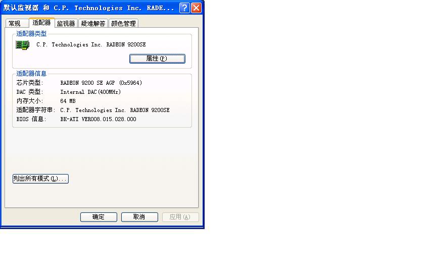 我点3楼图中的“高级”就出现下面个图了(4、5、6楼)。另外点“识别”电视机上出现一个“2”,计算机屏幕上出现“1”。点那个“疑难解答”没有反应。哦,我忘了,显卡上的S端有7个空,而电视机上的S只有4个空,我用的连线是4个针的。不知道这样有影响吗?