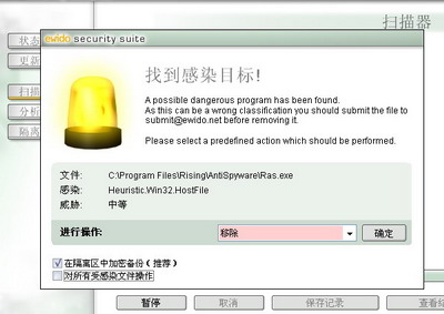 今天用EWIDO V3.5 扫描系统提示卡卡主程序RAS.EXE被感染木马?怎么办?