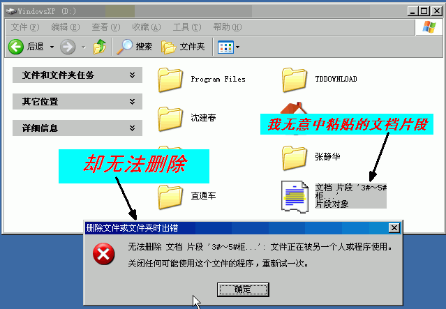 还可试试你可以到我的“网络优盘”里下载一个叫“删除任意文件_KillBox.exe”文件来删除一下你的想要删除的文件而又删除不掉的文件,它在“03_系统工具软件”文件夹下,自己找去吧