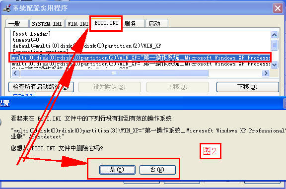 检查boot.ini文件,方法是在“开始”→“运行”→输入“msconfig”回车即可打开系统实用配置程序进行设置→参见下图红框中所示:→如果你已经将多余的系统删除了,它会扫描系统无效的启动项目的,参见下图2,再击“Y”它会自动删除无用的项目的,这种操作还安全可靠不会出错的。