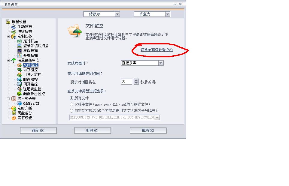新装的瑞星2007版开机后,监控中心转入后台自动处理,如何设置不使它自动处理,在右下角一直显示小绿伞。(自动转入后台时提示详见高级设置)但我在高级设置中找不到这一项。请高手指点。