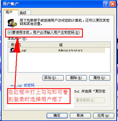 在“开始”→“运行”→输入“control.exe userpasswords2”进入“用户帐户”参见下图红框中所示: