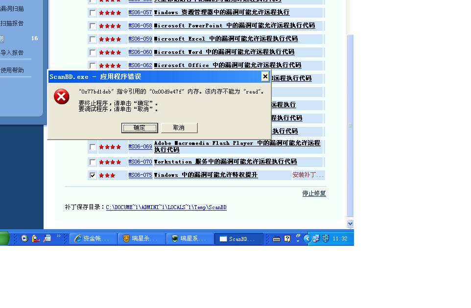下载补丁后只安装了一个MS06-078,还有16个漏洞下载好却不能安装,每次安装时就出如下对话框,是内存"不能读取?"请求帮助.谢谢!