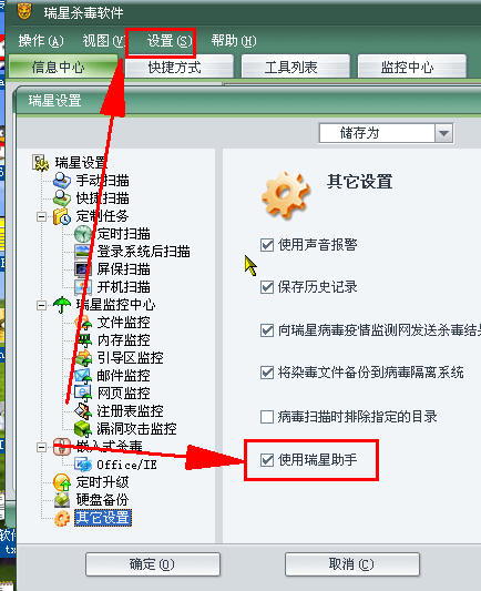 主界面,设置,详细设置,其他设置,使用瑞星助手