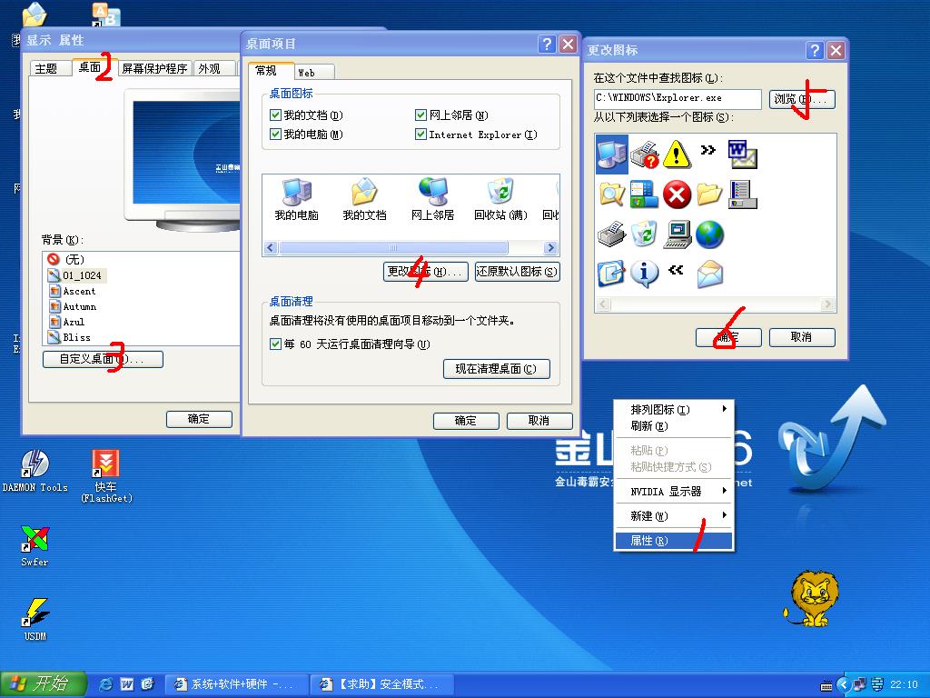 在桌面上右键,然后依次按照1、2、3、4、5的步骤点鼠标左键,选择你想要的图标后用鼠标左键盘点6。