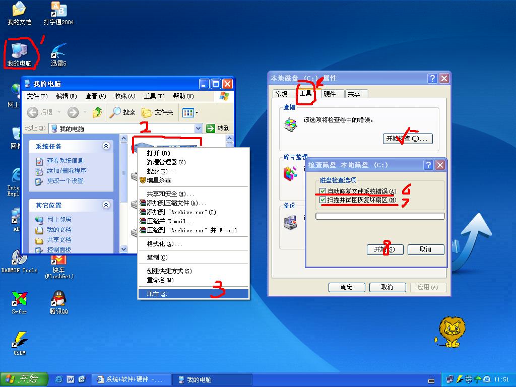 整理碎片前,先检查磁盘错误,方法见下图,按步骤进行: