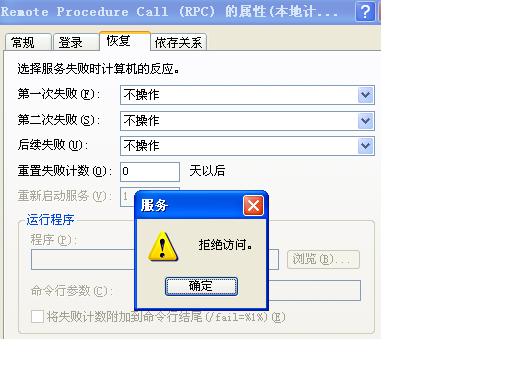 以前我将Remote Procedure Call (RPC)故障操作全部设置尾部操作,今天机器突然重启了,我打开服务察看Remote Procedure Call (RPC)后,发现Remote Procedure Call (RPC)恢复里面不能更改。详见附图,请高手支招解决。