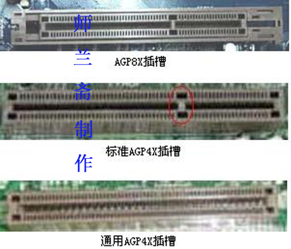标准AGP4X插槽跟通用AGP4X插槽最主要的区别是在插槽的右端增加了一个防呆卡位,这样就使得较古老的AGP 1.0规范接口的显卡无法插进。