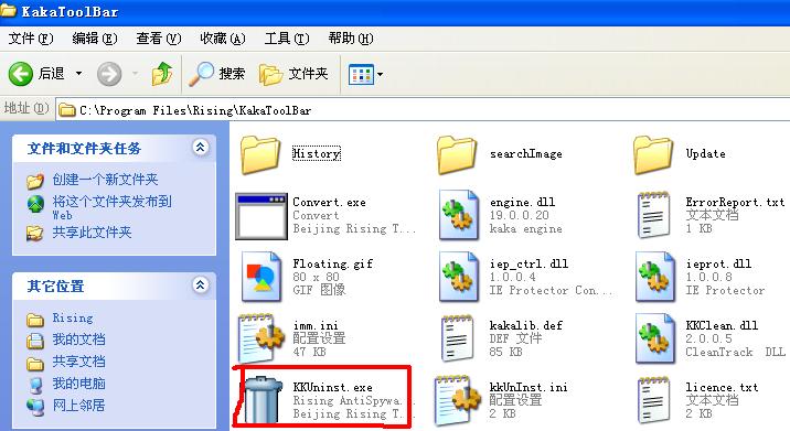或者从别的有卡卡的机上拷贝一个KKUNINST.EXE到你机的C:\PROGRAM FILES\RISING\KAKATOOLBAR文件夹下。