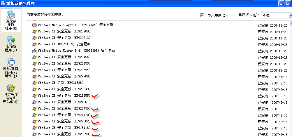 后来我又查看了添加删除程序的的安全补丁情况,发现这6个补丁已经安装上了。如图。