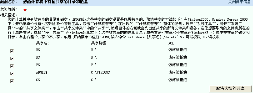 前两天我重装了XP SP2专业版的操作系统,用瑞星的杀毒软件的漏洞扫描发现:被共享的目录和磁盘。每次我点击了漏洞扫描下的“取消共享”之后,只能在电脑当时使用时有效,但重新开机后,又会在瑞星的杀毒软件的漏洞扫描发现发现:被共享的目录和磁盘。所以想请教一下:如何彻底取消电脑上的被共享的目录和磁盘?