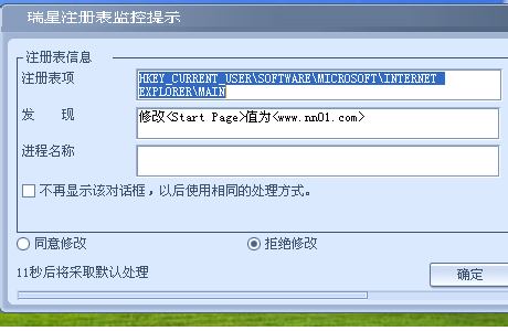 是别人用了我的电脑,就被修改了,现在是不想去,可一打开网页,就进去了,将主页设为空白后,瑞星注册表就跑出来不停的提示,设为拒绝修改,没效果,设为同意修改,也还是一个样,将注册表项删除后,打开网页还是这样。