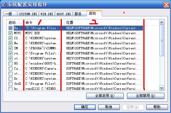 桌面状态下,开始--运行--输入“MSCONFIG”--回车,在下图1处寻找包含“C:\WINDOWS\system\AVICAP.dll”字段的开机启动项,然后在其对应的方框处取消勾选。接着,到图中2处看看注册表项值,开始--运行--输入“REGEDIT”--回车,进入注册表编辑器,寻找并删除该注册表项的对应键值。