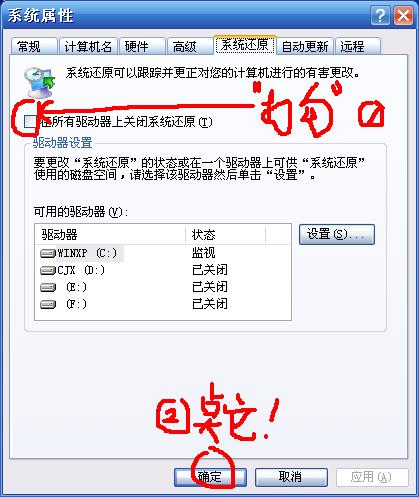“我的电脑”右键---属性--系统还原--关闭所有驱动器的系统还原